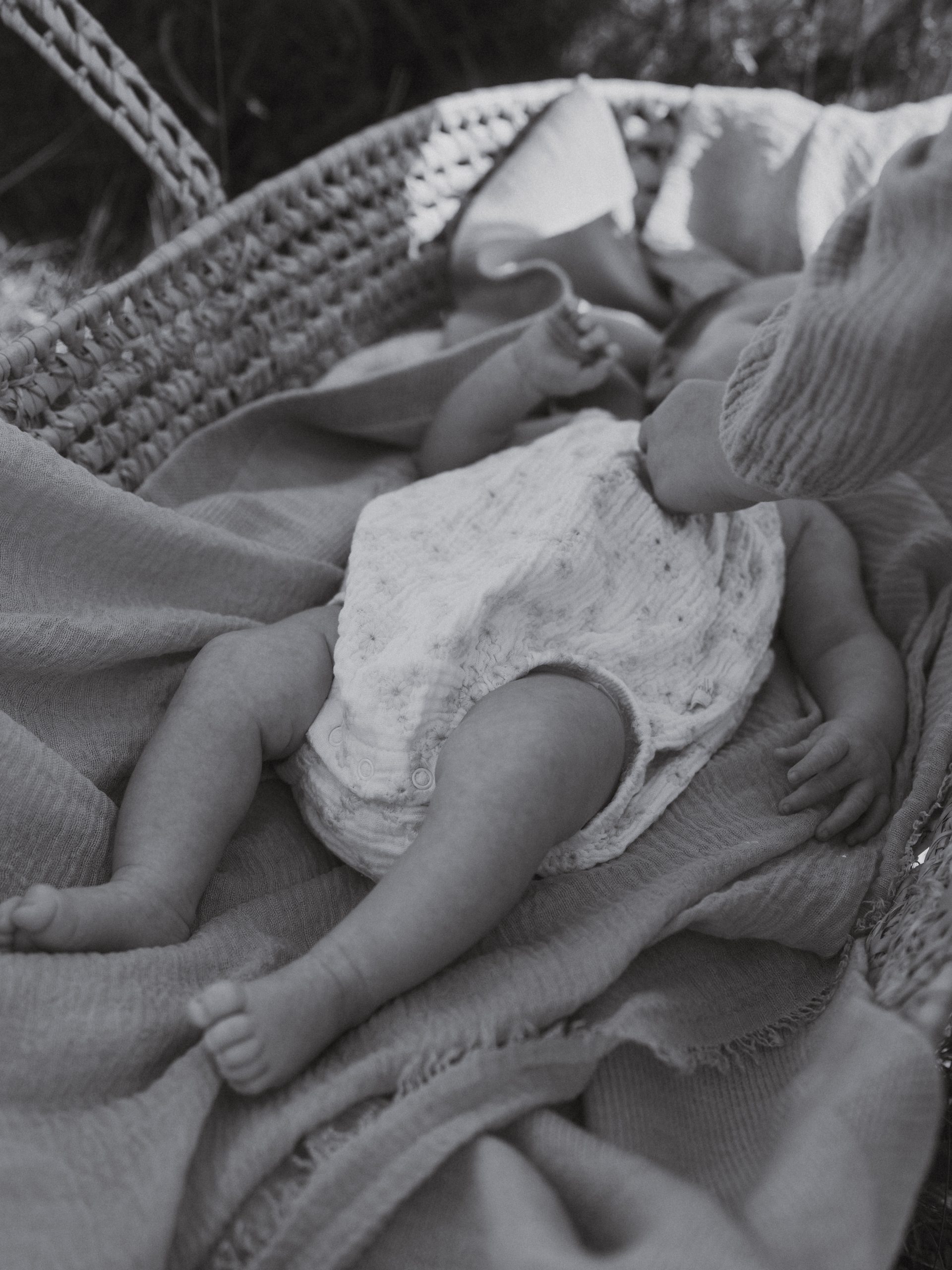 Ich bringe für euer Shooting alles an Requisiten mit, was wir brauchen: einen Korb, eine Kiste voller weicher, hochwertiger Materialien wie Leinen, Musselin und Wolle, dazu sanfte Töne und natürliche Details – getrocknete Blumen, Eukalyptus, Schleierkraut. Für Mädchen wähle ich gerne Rosé-Nuancen oder erdige Farben, für Jungen neutrale, warme oder blaue und grüne Töne. Alles wird mit größter Sorgfalt gereinigt – frisch gewaschen in duftneutralem Bio-Waschmittel, nach jedem einzelnen Shooting, genauso wie die Kleidung welche euch in meinem Kundinnenkleiderschrank für die Kleinen zur Verfügung steht.